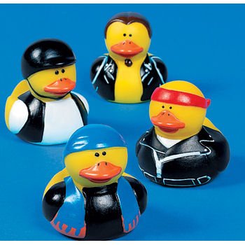 This set of 12 rubber duckys are each dressed as cool bikers. You'll receive a mixed set of 12 of the 4 styles pictured. Bald duck with red bandana and leather jacket, black vest and helmet, long brown haired dude with ponytail in leather jacket, and blue bandana dude with black t-shirt and blue vest. Each ducky measures approx. 2" x 2". They do not squeak but do have a hole in their beak for squirting water. They are not guaranteed to float upright. Great to hand out to your guests as party favors.Read more 12 Motorcycle Biker Rubber Duckys
