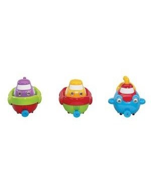 Fun, floating magnetic boats link together for following fun! Press and twist the boats for squeaking and clicking sounds. Boats have wheels so they can roll on the floor OR float in the tub!