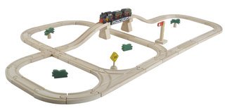 6258 Includes: -Set includes an intersection, 35 track pieces, 1 bridge, 1 classic train, 2 palm trees, 2 bushes and 2 rail signs.Read more PlanToys PlanCity Deluxe Train Set