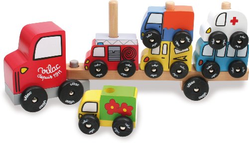 A beautifully crafted toy by well-respected toy makers Vilac who have been making toys for over one hundred years, whose passion and love of tradition is apparent in every item that they make. This wooden trailer with six individual cars is in a variety of colors and is exquisitely finished with fine details. The high quality finish means that this durable toy will stay hard wearing and bright even through regular use. The size, shape and weight mean that the toy is suitable for children from the age of two and up. Traditional and fun that helps to build hand eye co-ordination.Read more Vilac Truck and Trailer with Cars Stacker